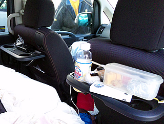 そして、一列目(と二列目)シートバックに装着された「パーソナルテーブル」がモノを言う!ドリンク類はもちろん、